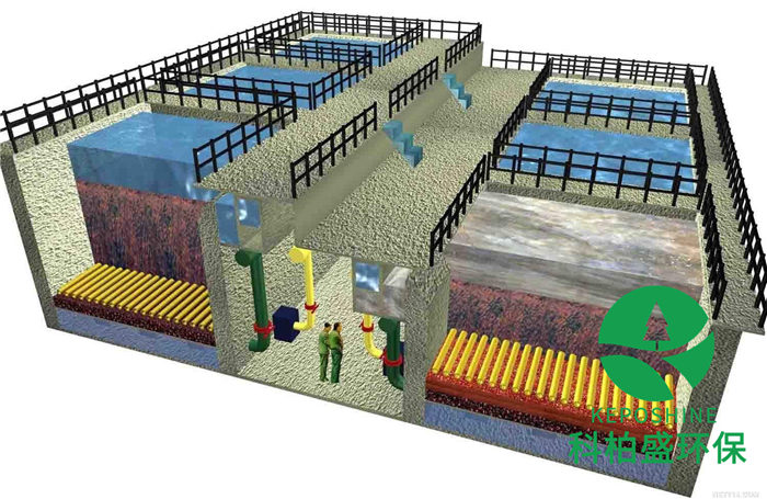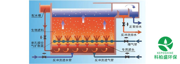 濾池采用鼓風曝氣係統進行曝氣(qì)供氧,濾料(liào)上的(de)好氧微生物在
