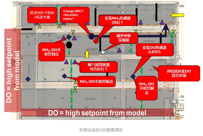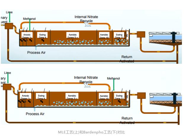 原來(lái)的汙水(shuǐ)處理就已采用生物(wù)脫氮處理的MLE工(gōng)藝,在這次升級中,為了(le)提高汙水處理線的(de)靈活性,原工藝改(gǎi)為了4段式的(de)Bardenpho工藝。在原工(gōng)藝裏(lǐ),甲醇投加點位於1區的缺氧區,在新工藝裏則移至了11區(qū)的(de)搖(yáo)擺兼容區(Swing Zone)。工藝改造後,出水總氮(dàn)從原來的8mg/L降至3mg/L!