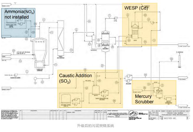 處理(lǐ)工藝方麵(miàn),他們采用的(de)是流化床焚燒(shāo)技術Fluid Bed Incinerator (FBI)。但如上麵提到的,因為標準的(de)提高,他們在(zài)需要在原來的洗滌塔後邊再新增一個除鎘的濕式電除塵器(qì)(WESP)、一個堿度補給單元和一個除汞單元。