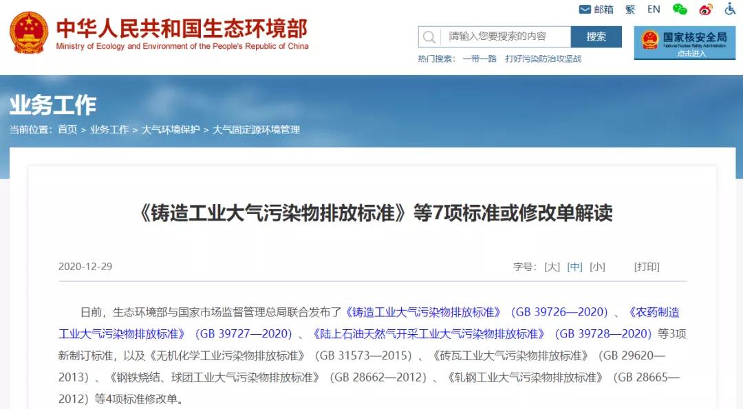 前幾日,本(běn)站分(fèn)享農藥、鑄造等七(qī)行業大氣汙染物排放國準發布,下月(yuè)起實施一(yī)文,因為近期生態環境部與*市場監督管理總局聯合發布了《鑄造工業大氣汙染物排放標準》(GB 39726—2020)、《農藥製造工業大氣汙染(rǎn)物排放標準》(GB 39727—2020)、《陸上石油天然氣開采工業大氣(qì)汙染物排放標準》(GB 39728—2020)等(děng)3項新(xīn)製(zhì)訂(dìng)標準,以及《無機化(huà)學工業汙染物排放標(biāo)準》(GB 31573—2015)、《磚瓦工業大氣汙(wū)染物排放標準》(GB 29620—2013)、《鋼鐵燒結、球團工業大氣汙染物排放標準(zhǔn)》(GB 28662—2012)、《軋鋼(gāng)工業大氣汙染物排放標準(zhǔn)》(GB 28665—2012)等4項標準(zhǔn)修改單。同時生態環境部近日發布了7項標準或修改單解讀,內容如下: