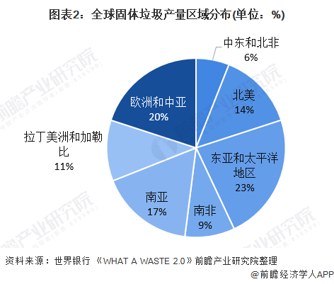 根據《WHAT A WASTE 2.0》公布的數據顯示,從全球固(gù)體垃圾(jī)產量區域分布來看,東亞和太平洋地區固體垃圾產(chǎn)生量(liàng)*多,占(zhàn)全球的比重為23%,其次為歐洲和中亞地區,其固體垃圾產生(shēng)量占全球的比重為20%,南亞地區固體垃圾產生量占全球的比重為17%,北美地區固體垃圾產生量占全(quán)球的比重為14%。