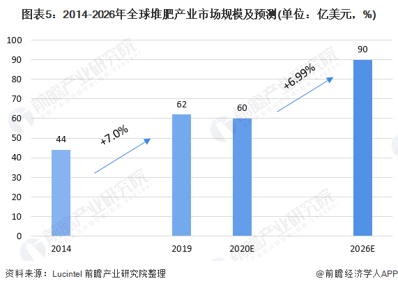 全球堆肥產業在農業,家庭園藝,園林綠化,園藝和建築行業都有機遇。根(gēn)據Lucintel公布的數據顯示,2019年全球堆肥產業市(shì)場規模為62億美元,由於COVID-19導致的全球經濟衰退,預計(jì)全球堆(duī)肥產業市(shì)場規模將在2020年下降,2020年全球堆肥產業市(shì)場規模約為60億美元,然而,市(shì)場將在2021年見證複蘇,預計到2026年將達到90億(yì)美元,從2020年到2026年的複合年增長(zhǎng)率為5%至7%。