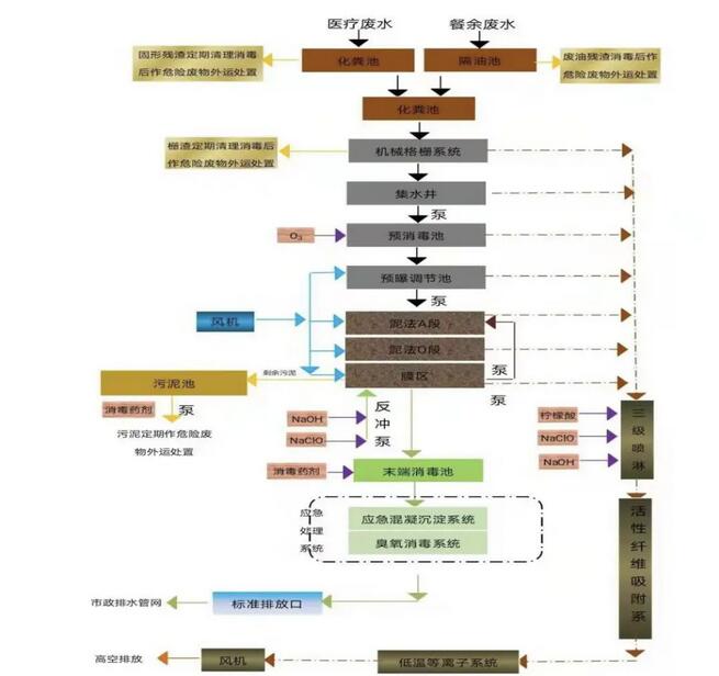 從(cóng)上圖(tú)流程能夠看出,該處(chù)理工藝重點(diǎn)環節如下:醫療廢水與餐餘廢水應分別經化糞池、隔(gé)油池做沉澱(diàn)處理並定期清理;機械格柵係統如維護不當較容易(yì)發生(shēng)故障,應對閘門等定期檢修、每日清理殘渣;膜區過後應對汙泥進行消毒並清理,加強日常檢查。