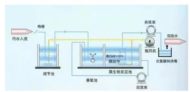 我們先就其中的MBR處理工藝做一下介紹:MBR 工藝又稱(chēng)膜生物反應器(Membrane Bio-reactor),是一種現代(dài)膜分離(lí)技術與生物技術有機結合的新型的水處理(lǐ)技術,它利(lì)用膜分離設備(bèi)將生化反應池(chí)中的活性汙泥(ní)和大(dà)分子有機物截留住,達到水(shuǐ)淨化(huà)的目的(de)。由於膜的高效分離作用,其分離效果遠好於傳統沉澱池,處理出水極其清澈,懸浮物和(hé)濁度(dù)接近(jìn)於零,細菌和病毒被大(dà)幅去除。鑒於此,新建醫院(yuàn)多采用該工(gōng)藝進行汙水處理,是目(mù)前廢水處理新技術之一,其工作流程如下: