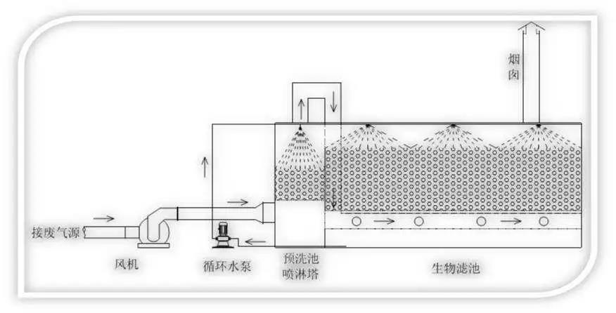 工(gōng)藝流程:臭氣收(shōu)集→風管輸送→抽風機→預洗(xǐ)池加濕→生(shēng)物濾池吸收→生物氧化→無害氣體排放