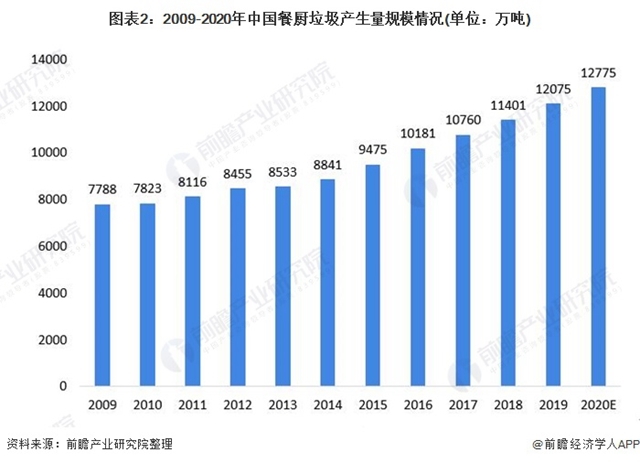 隨著我國消費升級,餐(cān)飲行業的發(fā)展迅速(sù),尤其是外賣行業的快速(sù)發展(zhǎn),餐廚垃圾的產生也逐年遞增。2015年全國餐廚垃圾產生量達9475萬噸,日均產量達26萬噸/日。統計顯示,我(wǒ)國餐廚垃圾占城(chéng)市生活垃圾比重大致範圍為37%-62%,由此得出理想(xiǎng)狀(zhuàng)態下,2019年,全國餐廚(chú)垃圾產生量(liàng)達到12075萬噸。