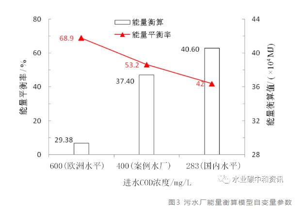 另外,從所構建的模型來看,汙泥厭氧消化回收(shōu)汙水中有機物能量的多寡完全(quán)取決於進水中的有機物濃度,即進水COD濃度越高,可回收的有機物(wù)能量(liàng)潛力便越大。繼而我們利用所構(gòu)建(jiàn)模型針對不同的進水(shuǐ)COD濃度進行了能量核算(suàn),結果如圖3所示。在我國汙(wū)水處理廠平均進(jìn)水COD濃度水平(283 mg/L),通過(guò)汙泥厭氧(yǎng)消(xiāo)化能量回收隻能實現約42%的能量平衡率;而當(dāng)進水COD濃度增(zēng)至600 mg/L時(歐洲(zhōu)平均水平),則回收的能量可以補償總能耗的68.9%。