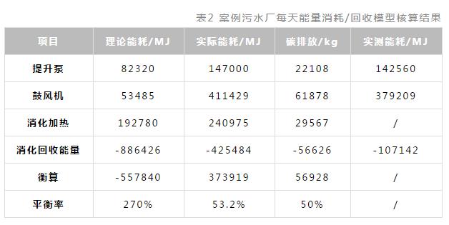 模型構建完畢後,我們(men)對案例(lì)水廠實際運(yùn)行的能量(liàng)狀況進行了(le)評價分析。圖2是案例汙水廠的工藝流程和部(bù)分點的實測參數,模型匡算結果(guǒ)總結於表2中。由結果可知,經過模型計算得到的提升泵和鼓風機能耗數值(147000 MJ/411429 MJ)與實測數值(142560 MJ/379209 MJ)相差(chà)不大,但通過汙泥厭(yàn)氧消化回(huí)收的有機物(wù)能量(425848 MJ)卻遠遠高於實測數值(107142 MJ),這是(shì)因為案例汙水廠2010年消化池平均進泥量僅為340 m3/d,僅占設計進泥量的12%,如果按照2010年產氣效率計算,當進泥量達到(dào)設計值時,甲烷產量(liàng)與模型計算結果也近乎一致。可見,本研究構建的模(mó)型計算結果是可信的。