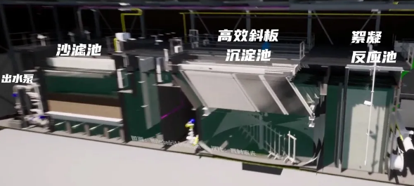 由於是處理運河抽上來的水,所以工藝組合不(bú)用(yòng)想生活汙水那麽複雜(zá),主要是用鐵鹽作絮凝沉澱,然後用高效斜板沉澱池作固(gù)液分(fèn)離,*後(hòu)再經過一層沙濾去除剩餘雜質。這套係統的年處理量據稱達1000萬立方米。