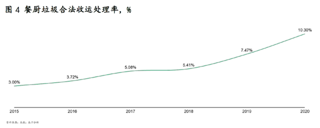 由於以(yǐ)上原因,我國餐(cān)廚垃圾回收並不完(wán)全。據統計(jì),盡管餐廚垃圾合法收運處理率近5年持續上升,但目前也僅為10%左右(見圖4)。