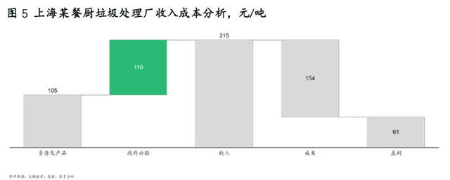 由於沼氣(qì)、粗油脂等資源化產物產量少、應用有限,在當前技術(shù)工藝下,餐廚垃圾處理的資源化價值很難獲(huò)得規模性與經濟(jì)性,商業模式尚未完全走順暢。目前(qián)我國政府對餐(cān)廚垃圾(jī)企業實行運行補貼和收運補貼,具體金額大小受技術、地區、試點發展過程、項目處理(lǐ)量等因素影響。調研發現,由(yóu)於資源化產品盈利有限,難以覆蓋全部成本,餐廚垃圾處理企業的盈利當前主要依靠政府補貼(見圖(tú)5)。