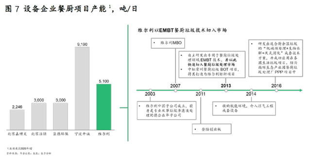展望“十四五”,我們認為有兩股力量不容忽視,餐廚垃圾處理行業真正激(jī)烈的市場競爭也許才(cái)剛(gāng)剛開始,一方是以寧波開誠、維爾利為代表(biǎo)的企業,他(tā)們進(jìn)入(rù)市場較早,主要(yào)提供技術(shù)或設(shè)備,同時具有一(yī)定的產能規模(mó)和先發品牌優勢(見圖7)。