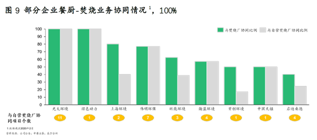 在垃圾分類全麵(miàn)推行的大背(bèi)景下,這些(xiē)大型固廢(fèi)企業正利用協同優勢降維打擊(jī)(見圖9)。一方麵,垃圾焚(fén)燒主業帶給這些企業資金和政府(fǔ)資源雙重優勢;另一方麵,協同處置帶來(lái)降本增效,可(kě)以幫助這些企業降低財務壓力:在收(shōu)入端,協同優勢在於餐廚沼渣餘電上網(wǎng);而在(zài)成(chéng)本端(duān),除可節約土(tǔ)建、人工等成本外,幹濕(shī)垃圾處置的發電(diàn)設備、除臭係統、滲濾液處(chù)理係統、蒸汽供熱係統等也可共(gòng)用,從而(ér)降低折舊(jiù)攤(tān)銷成本。