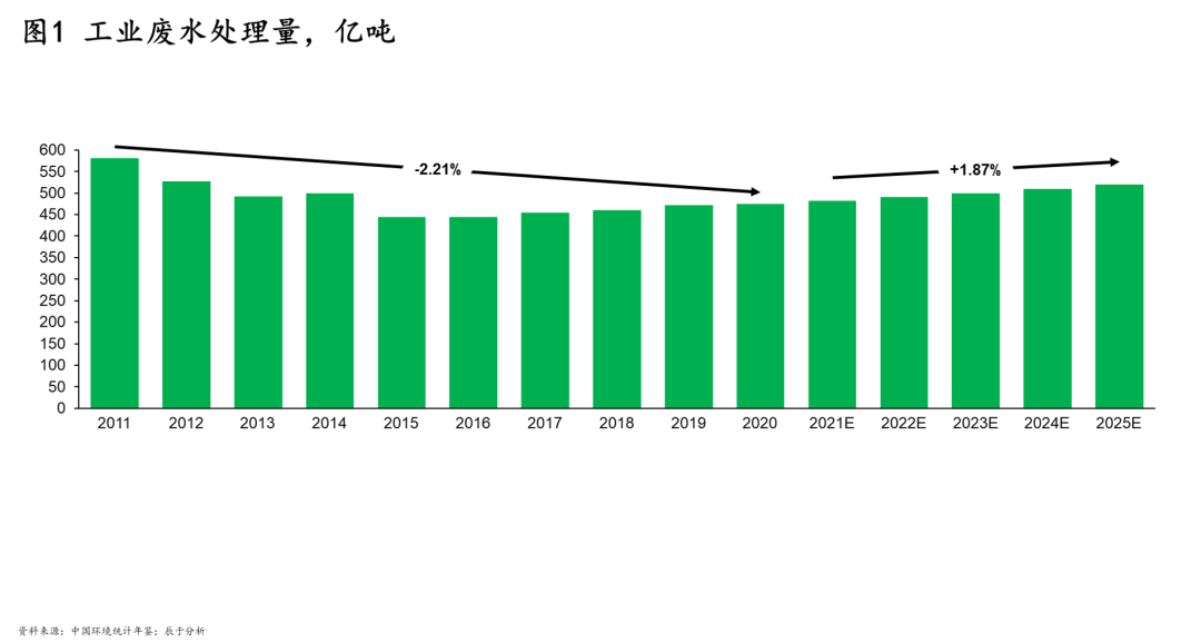 驅動力一:我國工業廢水處理量(liàng)將以1.87%的複合增(zēng)速緩慢增長