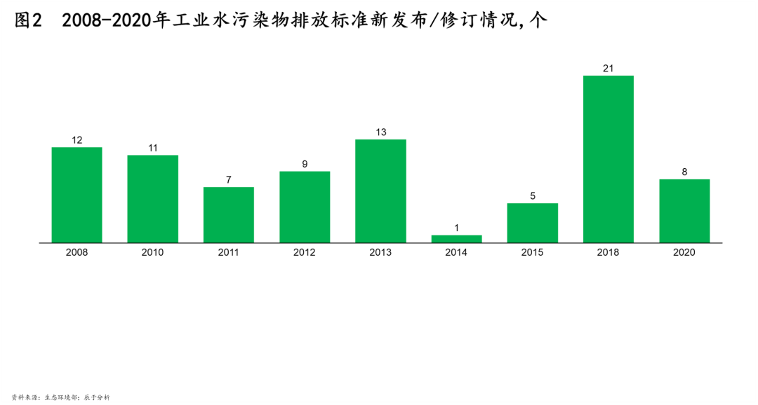 二是排放標準趨嚴,自行(háng)處理難度加大。中央環保督察已完成全覆蓋,*新的第二輪、第三批(pī)下沉工作任(rèn)務也已基(jī)本完(wán)成,8個中央生態環境(jìng)保護督察(chá)組於2021年4月6日至(zhì)4月9日陸續進駐8個省(區)開展督察。此外,我(wǒ)國(guó)自2008年起持續發布及修訂了包括造紙、化工等行業在內的水汙染物排放標準(zhǔn),不斷收緊水汙染物排放的限值(如圖2)。過去(qù),部分企業內部的廢水處理設施處於(yú)非正常運行狀態,開工率低、處理質量低,不利(lì)於達標(biāo)排放,第三方運營的重要性日(rì)漸凸顯(xiǎn)。