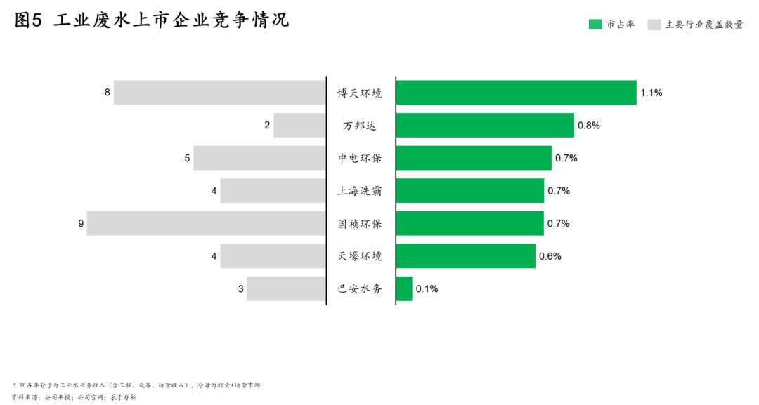 我國工業廢水上遊行業相當分散,即使是運營規模*大的化工行業,其占比也隻有18%(如圖4)。