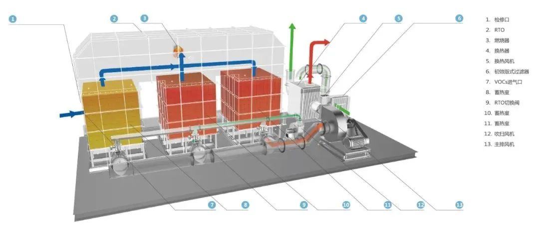 蓄熱式燃燒裝置(zhì),簡稱RTO,就是指將工業有機廢氣進(jìn)行燃燒淨化(huà)處理,並利用蓄熱體對待處理廢氣進行換(huàn)熱升溫、對淨化後排氣進行換熱降溫的裝置。