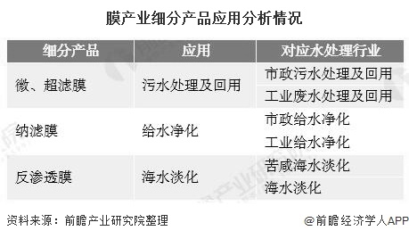水處理作為膜產業下遊的一個重要應用領域,也(yě)是膜材料的主(zhǔ)要去向:微濾膜主要應用於汙水、廢水處理等領域;超濾膜在汙水、廢水處理及回用和給水淨水(shuǐ)領域應(yīng)用廣泛;納濾膜主要應用於純淨(jìng)水、軟化水、無離子水、海水淡化等方麵;而反滲透膜可應用在海水淡化等領域。