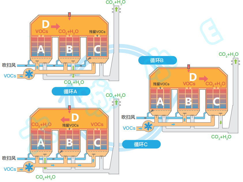 有機廢氣從A室進入,在(zài)催化(huà)氧化爐內被加熱到250~300℃後有機廢氣(qì)在貴金屬催化劑的作用下發生無焰燃燒,廢氣中的有機物被分解(jiě)成CO2和(hé)H2O,通過B室釋放熱量,溫度降低後排放,而蓄(xù)熱室B的陶(táo)瓷吸熱,“貯存”大量的熱量(用於下個循環加(jiā)熱使用),同時C室執行反吹動(dòng)作;在(zài)切換新周期後,廢(fèi)氣從B室進入,經催化氧化處理通過C室釋放熱量後排出,同時A室執行反吹動作;再下個周期(qī)則是廢氣從C室(shì)進入,經催化氧化處理後通過A室釋放熱量後排出,同時B室執行反吹動作;如此循(xún)環往複。