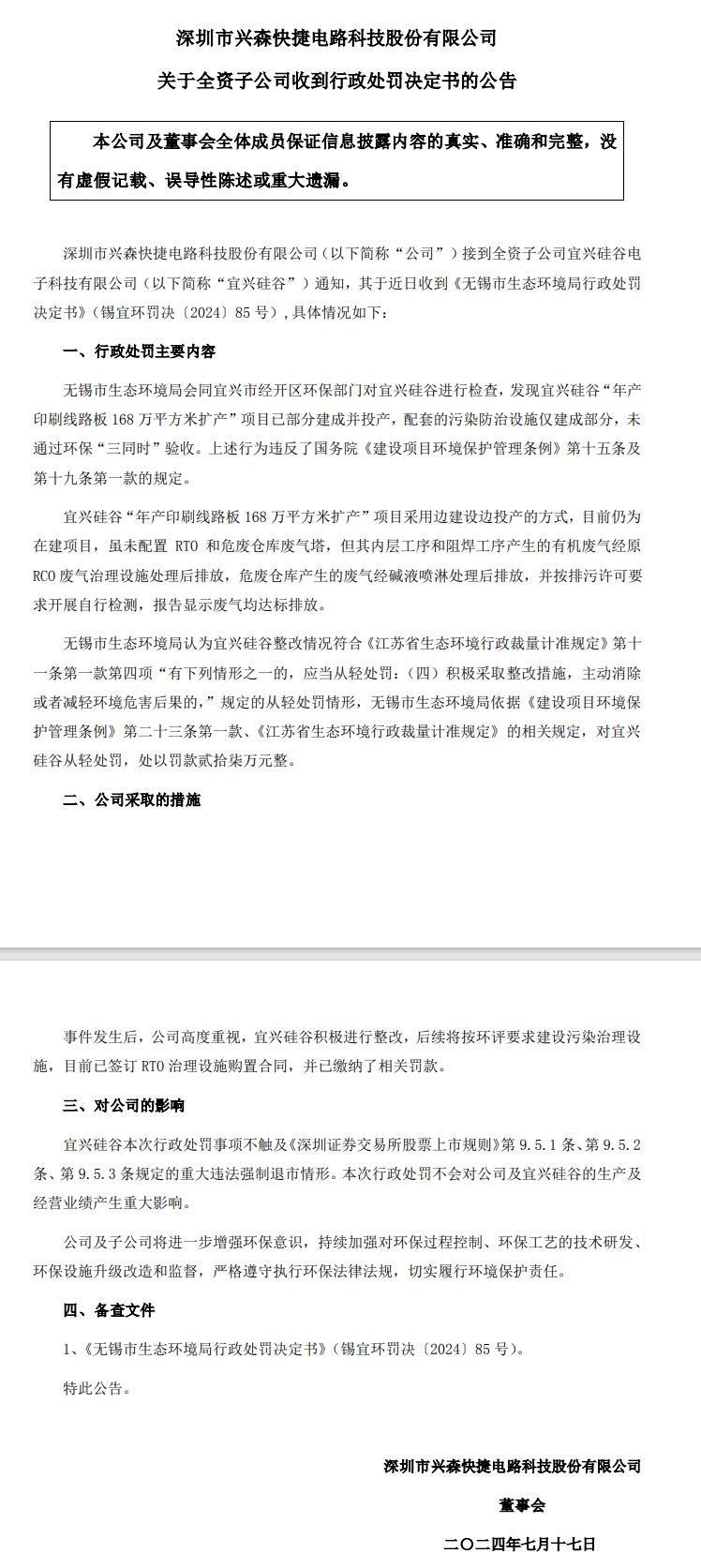 深圳市興森快捷電路科技股份有限公司(簡(jiǎn)稱:興森(sēn)科(kē)技)近日公告稱,公司全資子公司宜興矽穀電子科技有限公司(下(xià)稱“宜興(xìng)矽穀”)收到了《無錫市生態環境局行政處罰決定書(shū)》(錫宜環罰決〔2024〕85 號(hào)),原因係(xì)“年產印(yìn)刷線路板 168 萬平方米擴(kuò)產”項目已(yǐ)部分建成並投(tóu)產,配套的汙染防(fáng)治(zhì)設施僅建成部分,未通過環保“三同時”驗收。