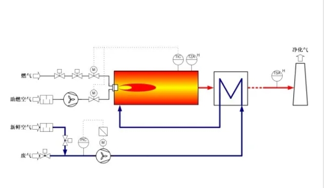可回收利用廢(fèi)氣中的熱能,降低能耗。在燃燒或催化燃燒過程中產生的(de)大量熱量可以用於預熱助燃空氣或其(qí)他工(gōng)藝流程中,實現能源的再利用,符合循環經濟和綠(lǜ)色環(huán)保(bǎo)的理念。