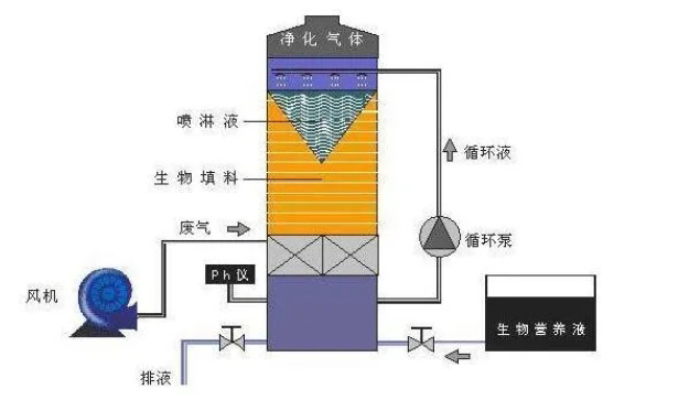 生(shēng)物滴濾法:結合了生物(wù)過濾和噴淋的優點,廢氣在塔內與生物濾料接觸並(bìng)降解。這種方法可以(yǐ)有(yǒu)效地去除多種VOCs,同時還可以去除顆(kē)粒物和臭味。